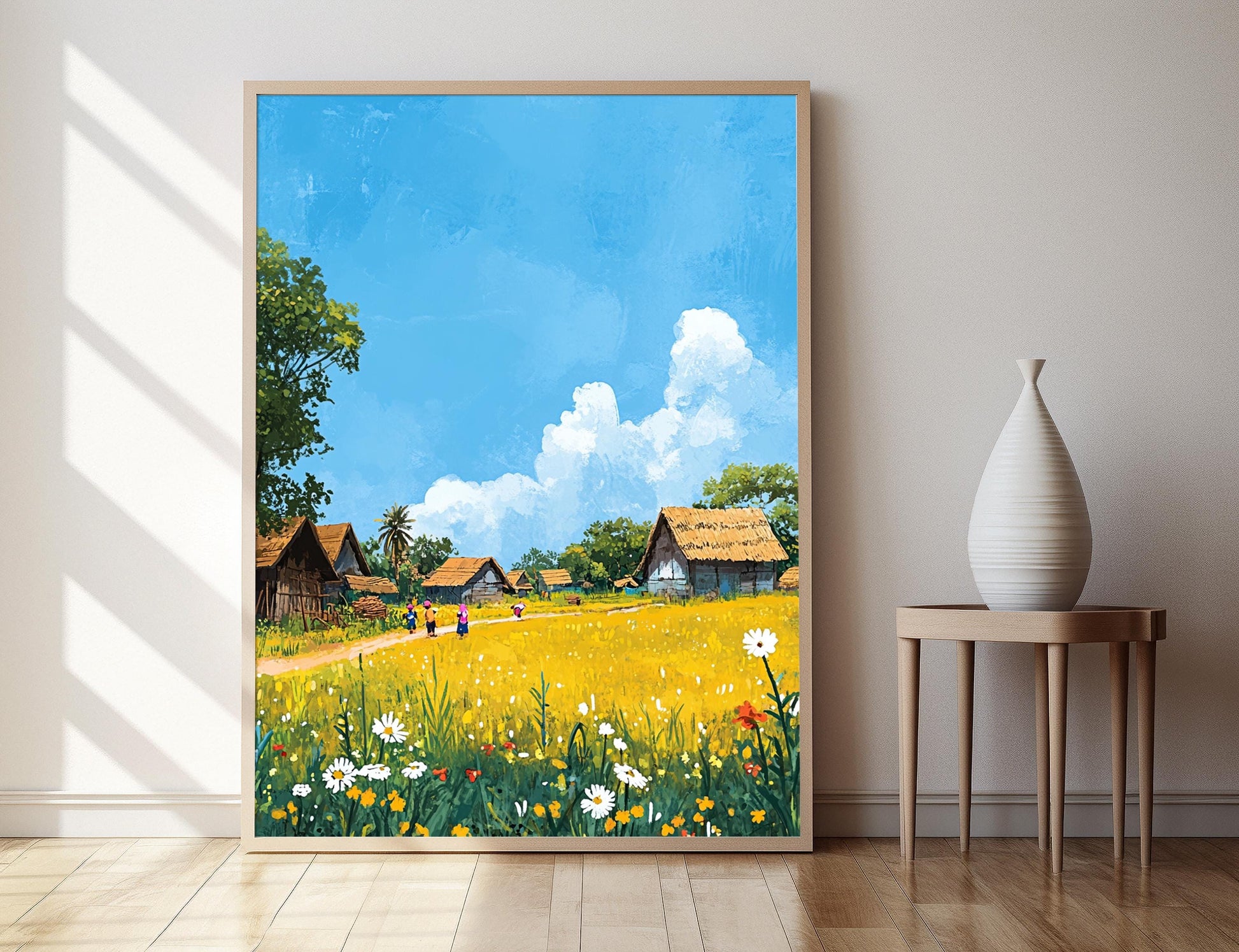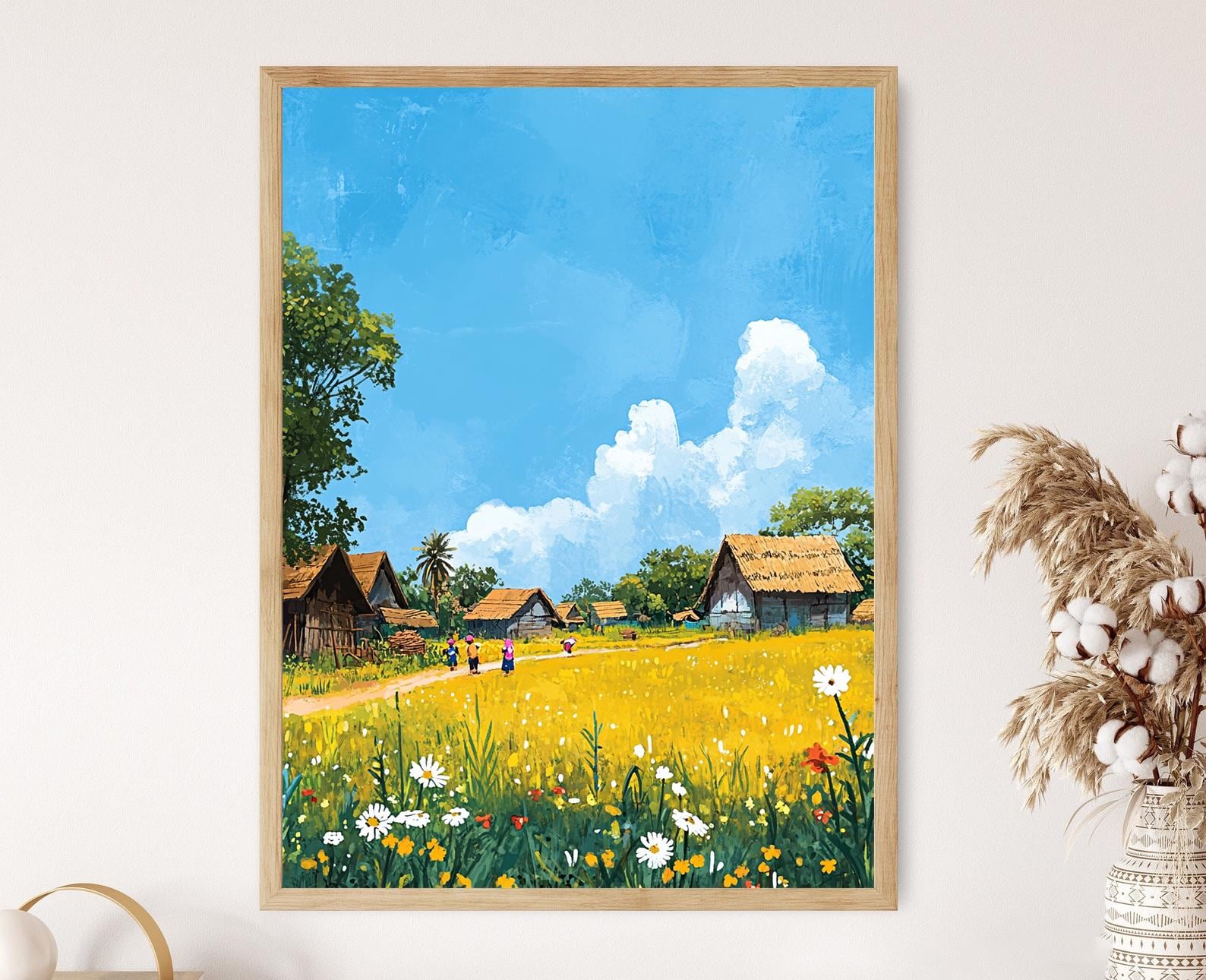 Découvrez cette affiche vibrante qui célèbre la beauté rurale de Tangail, où des fermiers s'activent et des enfants jouent sous un ciel lumineux. Cette illustration empreinte de douceur et de sérénité apporte une touche de vie à votre décoration murale, faisant de ce poster mural un choix idéal pour les amateurs d'art mural inspiré par la nature et la simplicité de la vie à la campagne. Laissez-vous séduire par cette œuvre qui évoque des émotions de joie et d'harmonie.