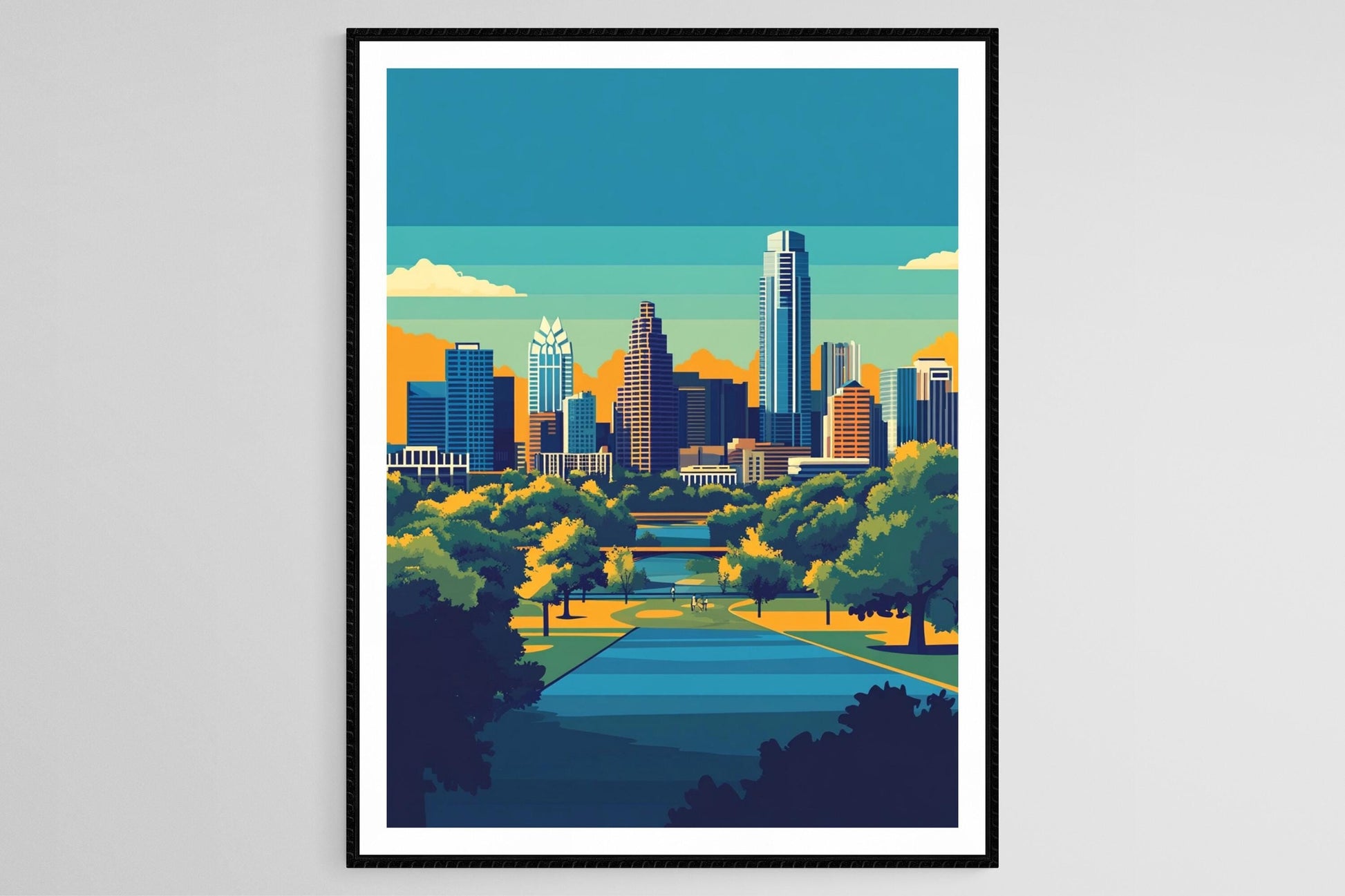 Découvrez notre affiche "City of Austin" qui célèbre le charme vibrant d'Austin à travers une illustration vectorielle moderne. Cette œuvre d'art mural met en lumière des monuments emblématiques du Texas, évoquant une atmosphère dynamique et conviviale. Parfaite pour enrichir votre décoration murale, elle apportera une touche unique et colorée à votre intérieur.