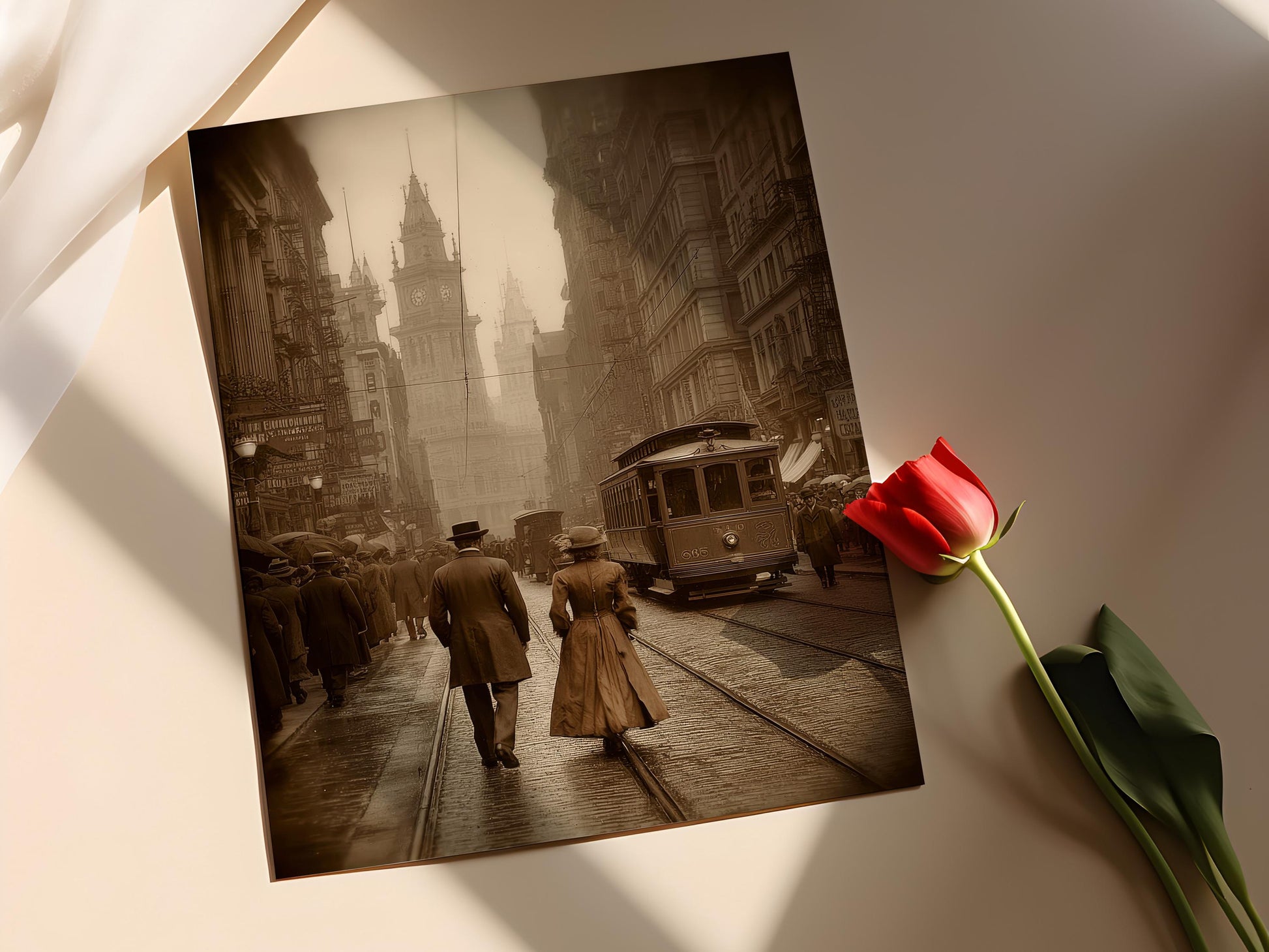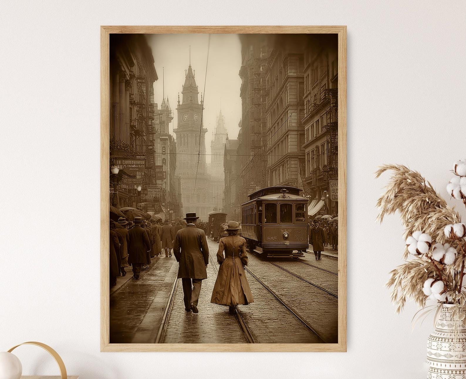 Découvrez cette affiche captivante qui vous plonge dans le charme des années 1920 à Boston. Cette illustration en sépia représente une scène de rue animée, où des piétons élégamment vêtus croisent un tramway vintage, le tout sous l'ombre majestueuse de l'architecture de la ville. Parfaite pour enrichir votre décoration murale, ce poster mural évoque une nostalgie et une sophistication intemporelles, apportant une touche d'histoire et de style à votre art mural.