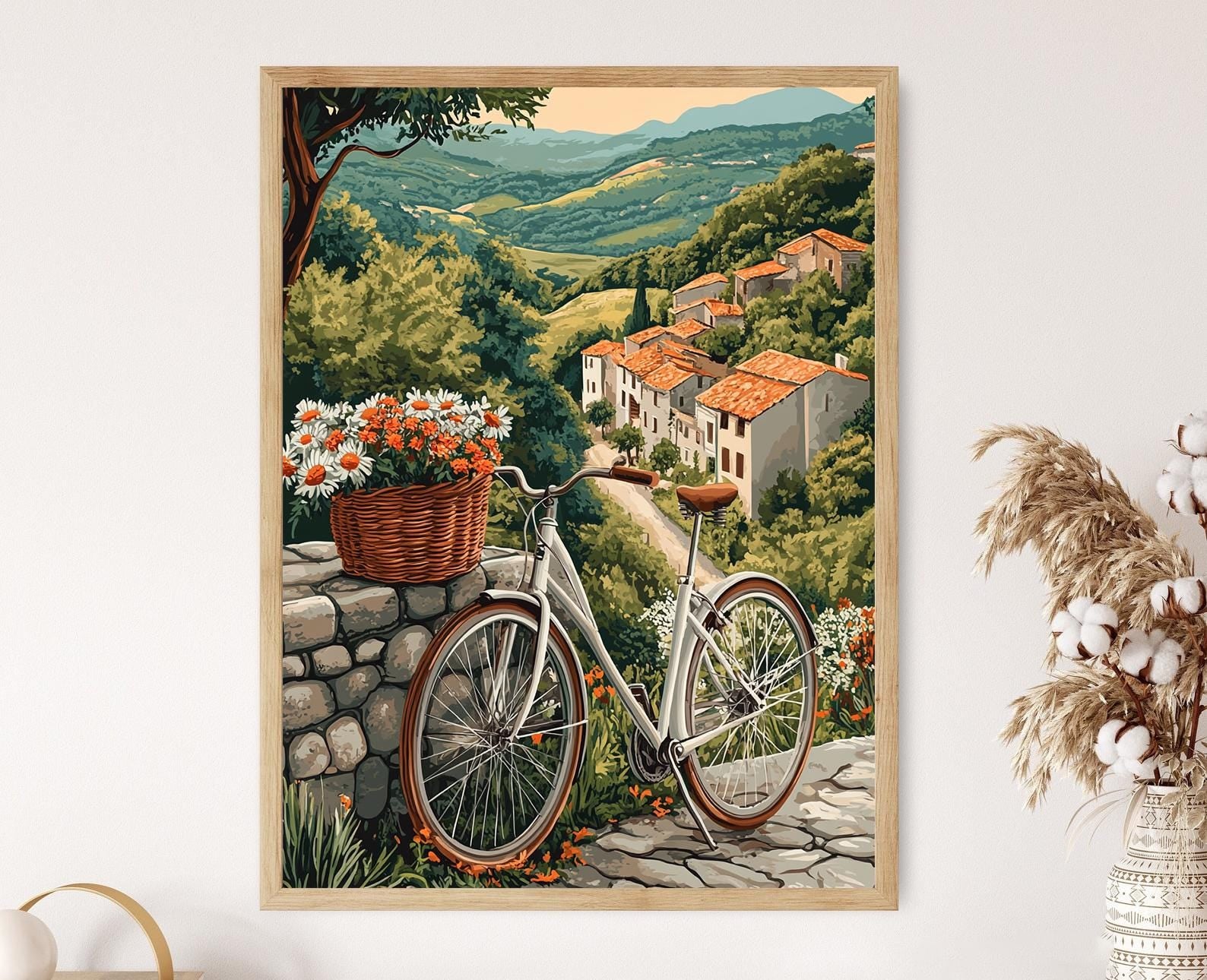 Découvrez notre affiche captivante qui met en scène une bicyclette vintage ornée d'un panier fleuri, évoquant la sérénité d'une ferme argentine. Cette illustration délicate et nostalgique apporte une touche de charme rustique à votre décoration murale, idéale pour enrichir votre art mural avec une atmosphère paisible et bucolique. Adoptez ce poster mural pour transformer votre espace en un havre de tranquillité et d'élégance intemporelle.