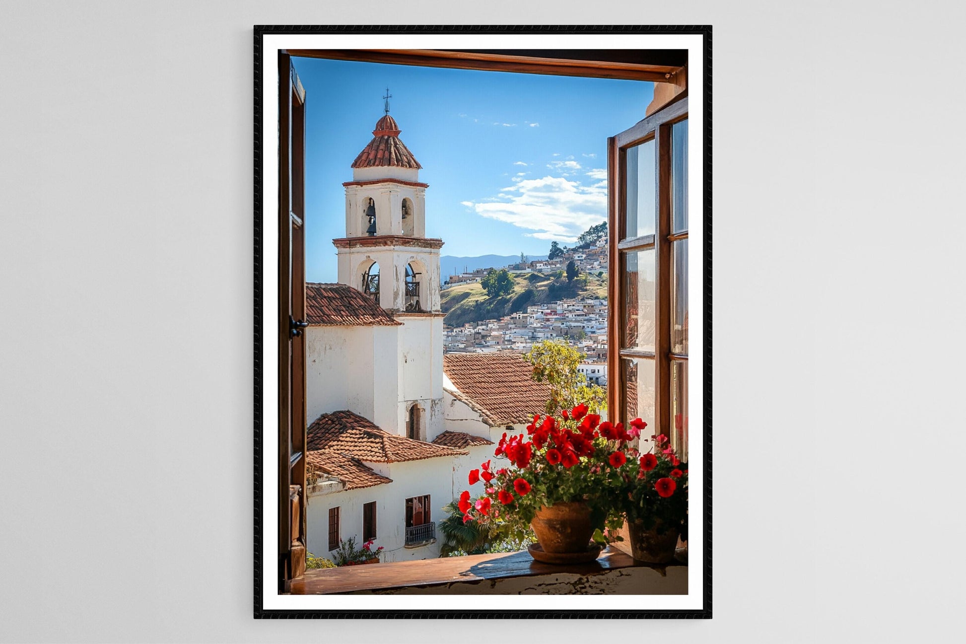 Cette affiche enchanteuse présente une vue de fenêtre sur Sucre, en Bolivie, où des fenêtres coloniales classiques sont ornées de géraniums rouges éclatants. L'illustration évoque une atmosphère nostalgique, mettant en valeur la beauté intemporelle des bâtiments blanchis à la chaux et des toits en tuiles rouges du centre historique, idéale pour toute décoration murale. Ce poster mural est un hommage vibrant au patrimoine bolivien et apportera une touche d'élégance à votre art mural.