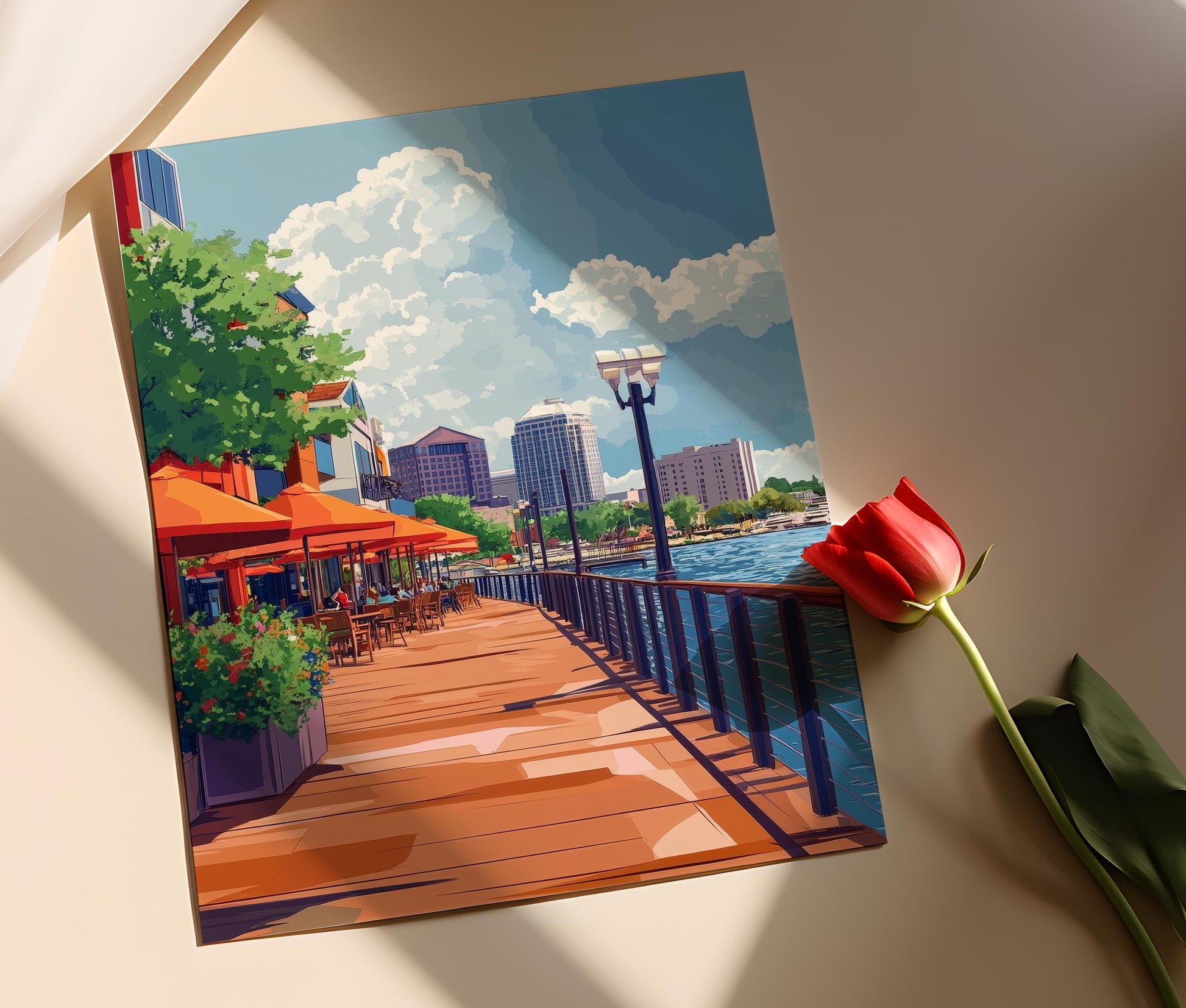 Découvrez notre affiche captivante représentant le vibrant front de mer de Wilmington, où l'animation des restaurants et la modernité du promenade s'harmonisent avec l'élégance de la skyline. Cette illustration murale évoque une atmosphère dynamique et chaleureuse, parfaite pour enrichir votre décoration murale tout en célébrant le charme urbain et la vie au bord de l'eau. Idéale pour les amateurs d'art mural, elle apporte une touche de fraîcheur à votre intérieur.